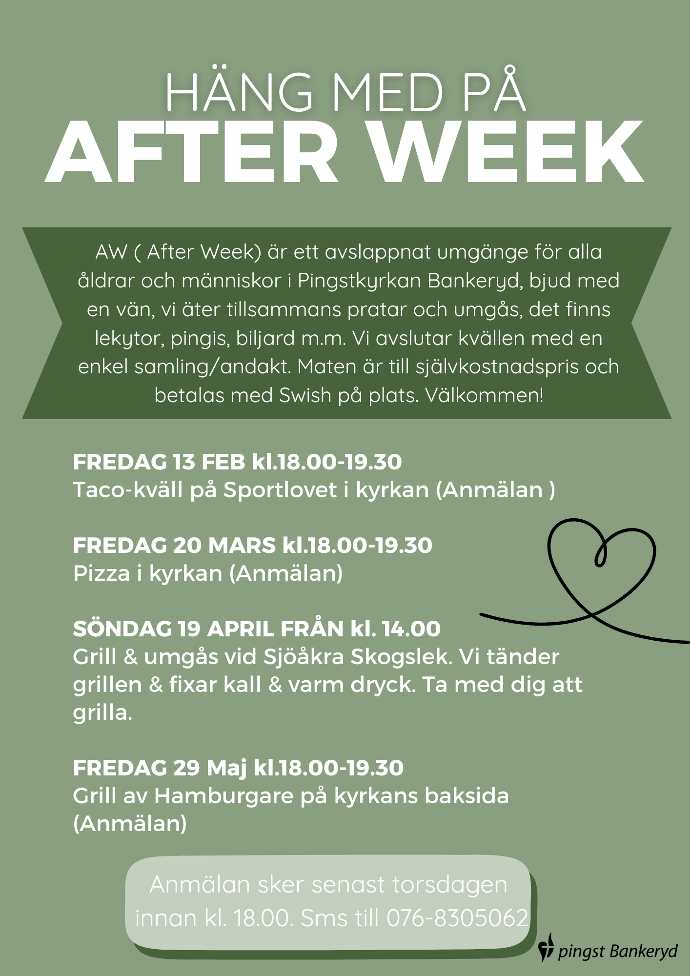 AW = After Week är ett familjevänligt umgänge i kyrkans källare en för alla åldrar och människor. Är du van att komma till kyrkan eller aldrig har varit här, välkommen! Vi äter taco eller pizza tillsammans till självkostnadspris. En kväll för gemenskap, samtal, att ta med en vän. Det finns pingisbord, biljard och lekytor för barnen. Kvällen avslutas med en enkel samling/andakt.