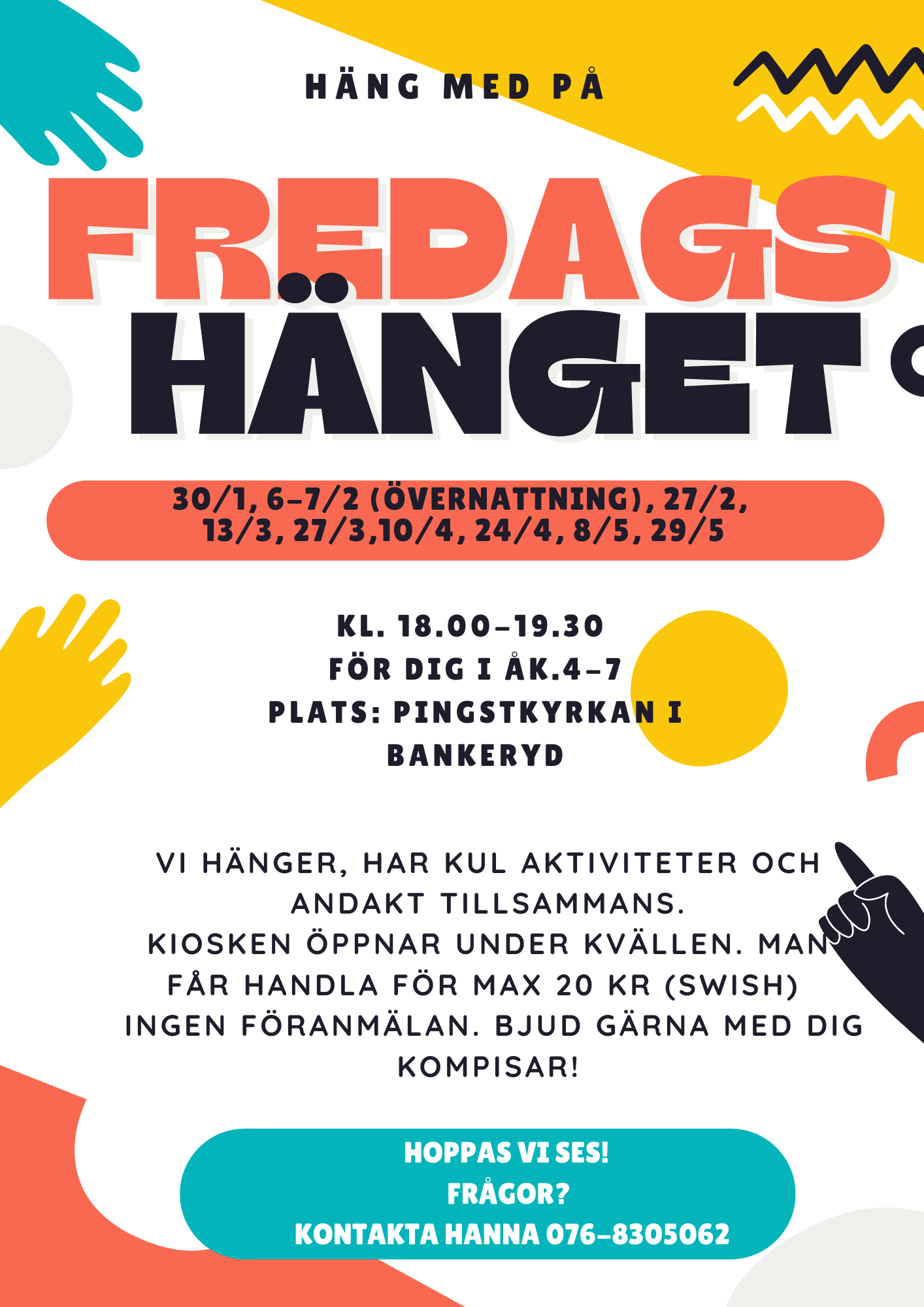 Vi hänger, har aktivitet och andakt tillsammans. Vi öppnar kiosken där man kan handla billigt med swish ( Max 20 kr). Bjud gärna med kompisar! Ingen föranmälan behövs.