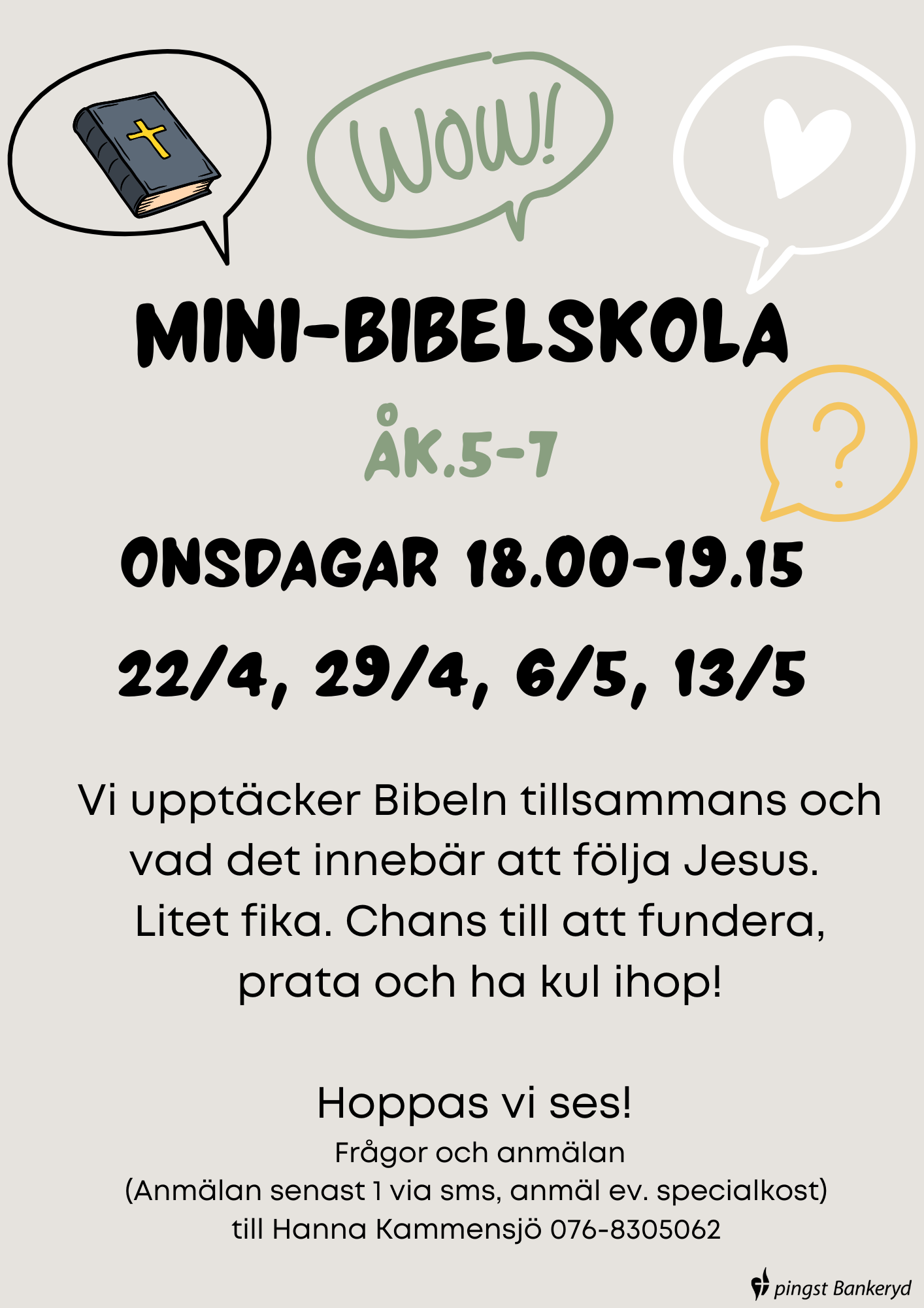 Bibelsnack, tävlingar, litet fika och annat kul! För vårterminen 2025 planerar vi för Mini-Bibelskola igen: